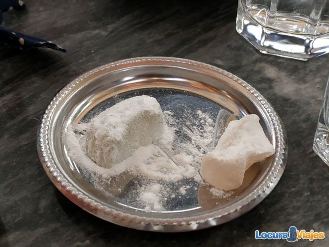 El loukoumi es un dulce con un interior que recuerda a la gelatina. Puede estar elaborado de multitud de frutas, nosotros hemos probado el de mastija y el de bergamota, pero podéis encontrarlo de otras frutas y también con algún fruto seco en su interior. Su aspecto exterior siempre llama la atención por el azúcar en polvo o glas, teniendo forma de cuadrado o rectángulo.