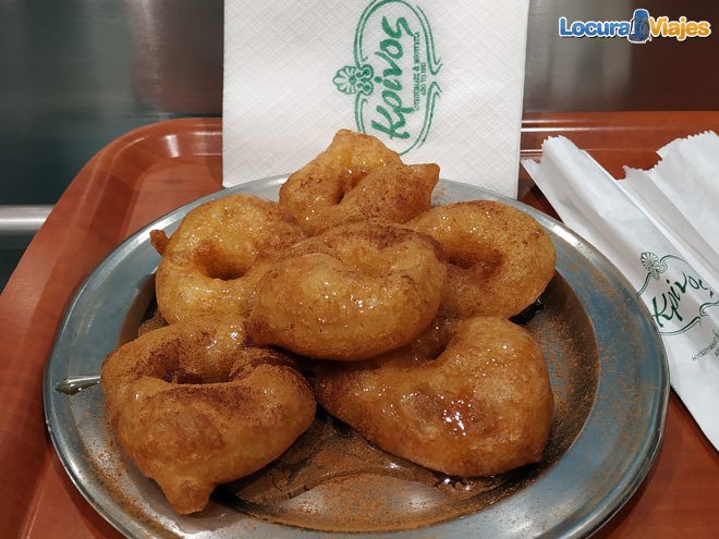Lo ideal es comerlos recién hechos. ¿Veis la bandeja de la foto? Lo común es que todos esos sean una ración para una persona. En Krinos, donde nosotros lo comimos, la ración de 6 loukoumades es de 3,30 euros.